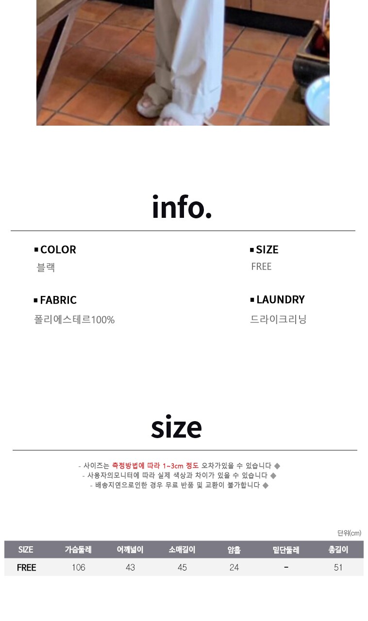 • 처음 배송된 상품상태와 다를 경우(세탁/착용 후 외출하신 경우) 반품이 불가합니다.