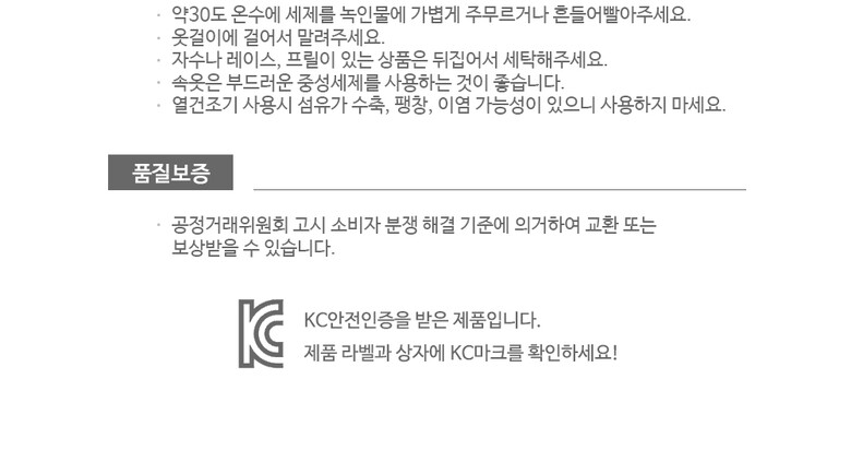 | 6. 세탁방법 및 취급시 주의사항 | 30도 온수로 중성세제를 사용하여 손세탁 및 분리세탁을 권장합니다. |