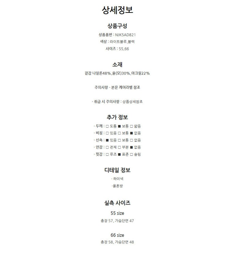 | 1. 제품 소재 (섬유의 조성 또는 혼용률을 백분율로 표시, 기능성인 경우 성적서 또는 허가서) | 나일론 48%, 모 30%, 아크릴 22% |