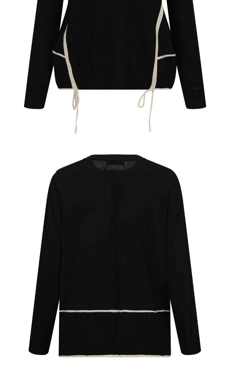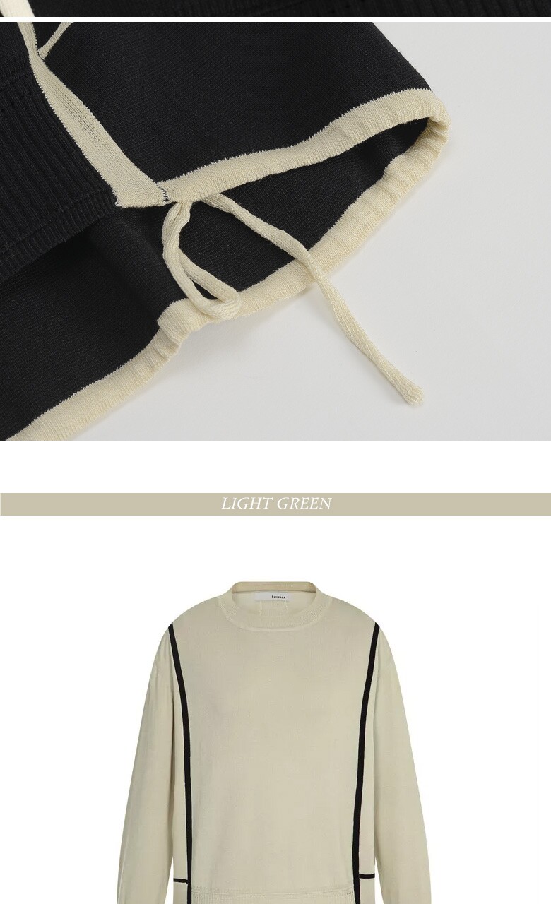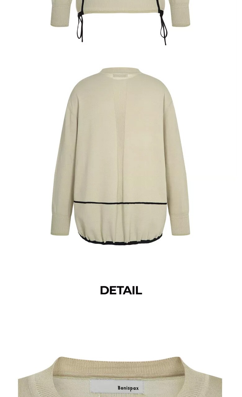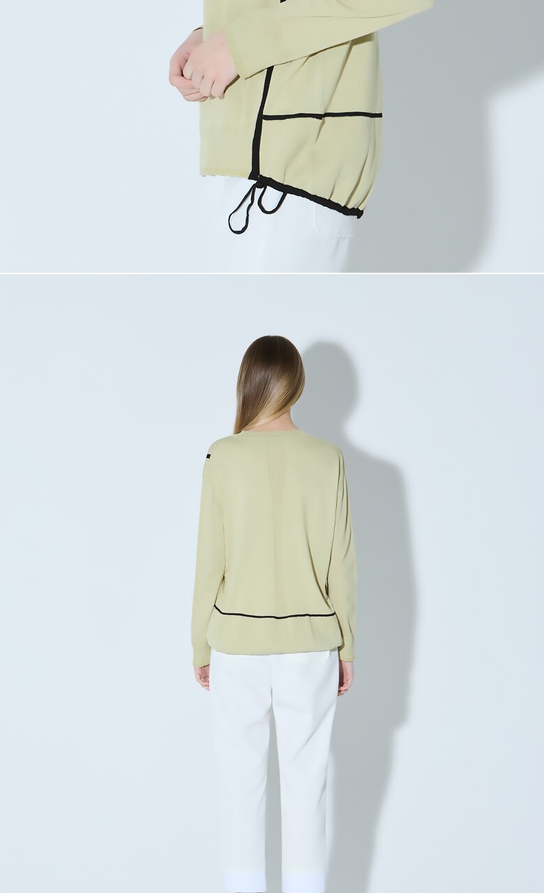 배색 라인과 밑단 스트링 디자인 세련된 니트 입니다. 브랜드만의 고급 소재를 활용하였으며 면소재로 활용으로 편안하고 우수한 착용감을 선사합니다. 가벼운 착용감으로 데일리하게 입기 좋은 아이템 입니다.