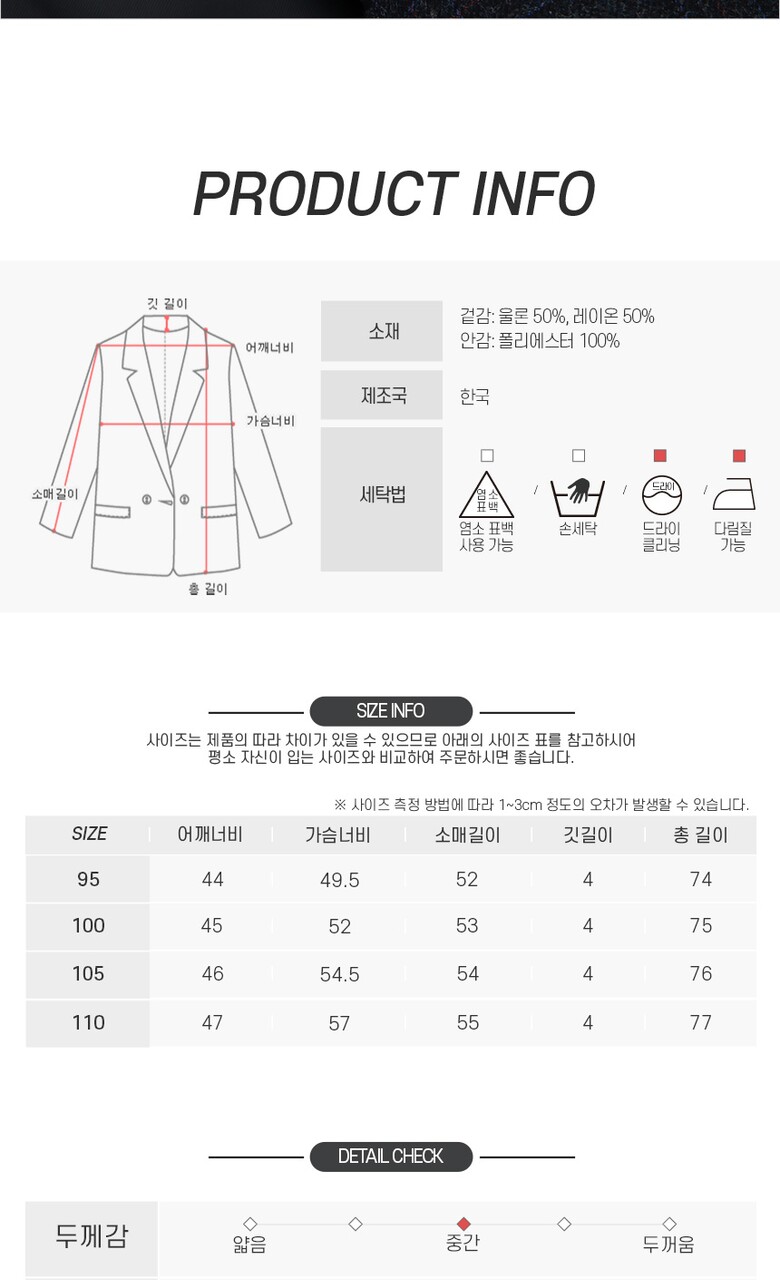 1. 제품 소재 (섬유의 조성 또는 혼용률을 백분율로 표시, 기능성인 경우 성적서 또는 허가서) | 겉감:울론50%,레이온50%, 안감:폴리에스터100% |