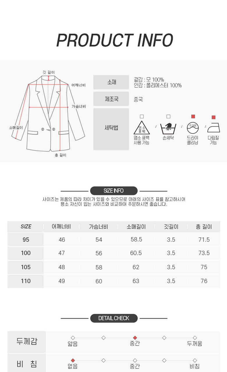1. 제품 소재 (섬유의 조성 또는 혼용률을 백분율로 표시, 기능성인 경우 성적서 또는 허가서) | 겉감:모100%, 안감:폴리에스터100% |