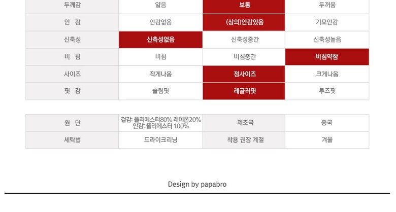 1. 제품 소재 (섬유의 조성 또는 혼용률을 백분율로 표시, 기능성인 경우 성적서 또는 허가서) | 겉감:폴리에스터80%,레이온20%, 안감:폴리에스터100% |