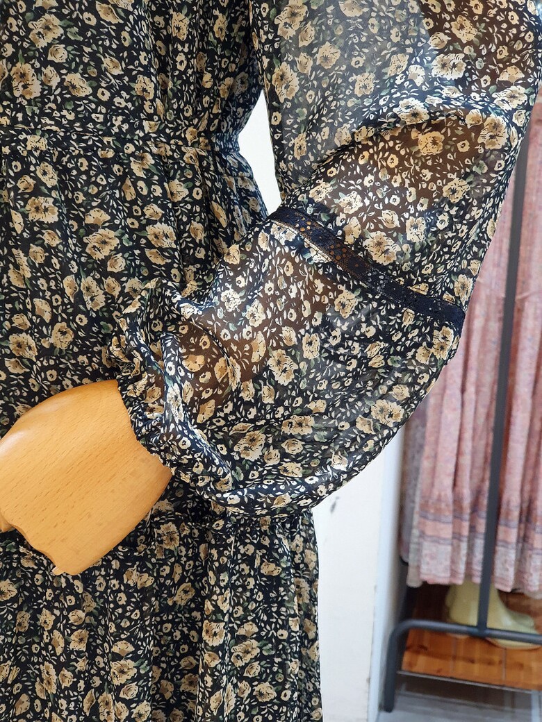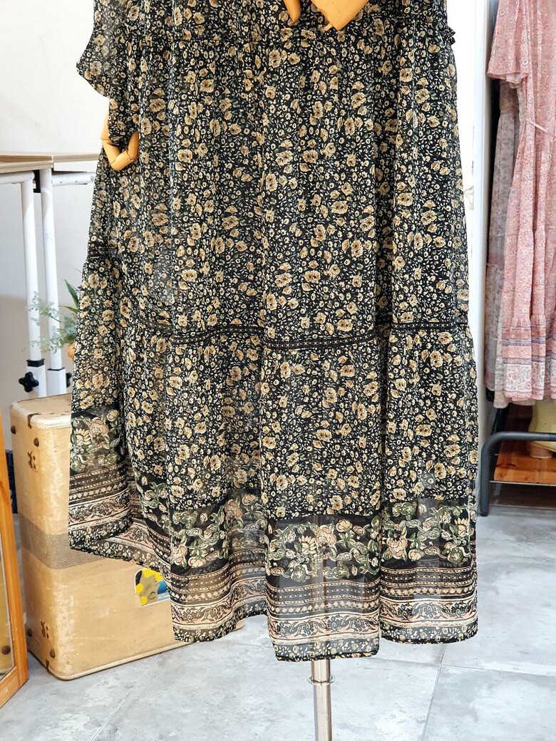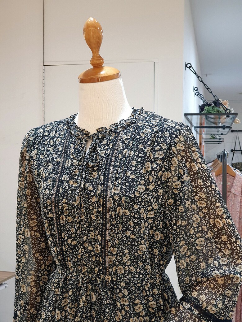 여성스러운 무드의 맥시 한 기장의 보더 시폰 원피스입니다.