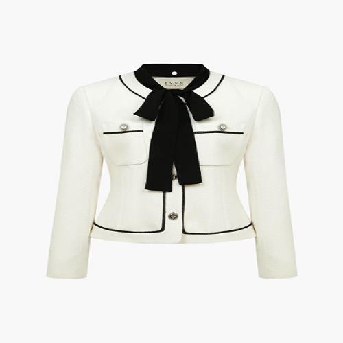 트위드 소재에 리본과 배색 라인이 포인트로 들어간 클래식 무드의 자켓입니다.