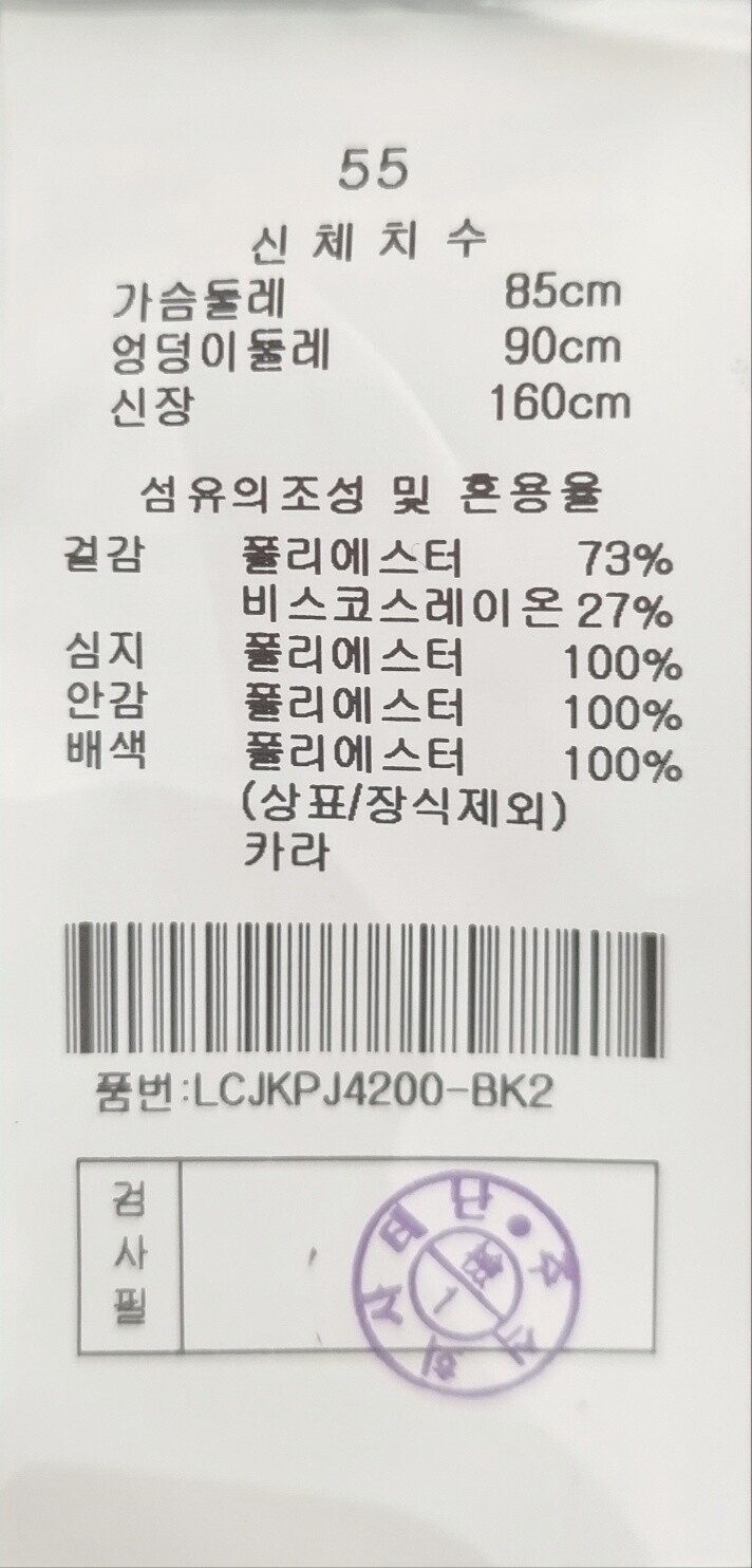 | 1. 제품 소재 (섬유의 조성 또는 혼용률을 백분율로 표시, 기능성인 경우 성적서 또는 허가서) | 폴리에스터73%, 비스코스레이온27% |