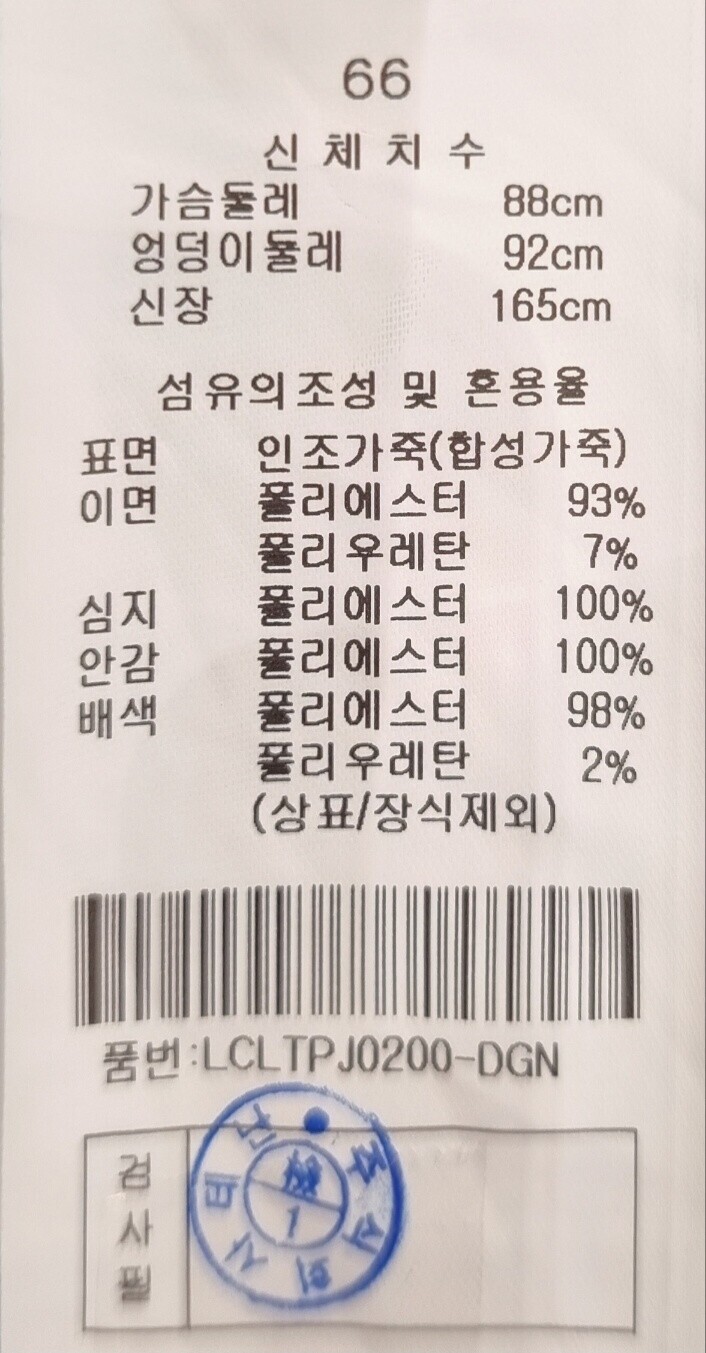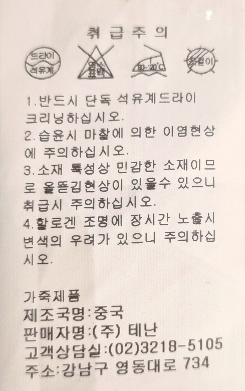 6. 세탁방법 및 취급시 주의사항 1.반드시 단독 석유계 드라이크리닝하십시오. 2.습윤시 마찰에 의한 이염현상에 주의하십시오. 3.소재 특성상 민감한 소재이므로 올뜯김현상이 있을수 있으니 취급시 주의하십시오. 4.할로겐 조명에 장시간 노출시 변색의 우려가 있으니 주의하십시오.