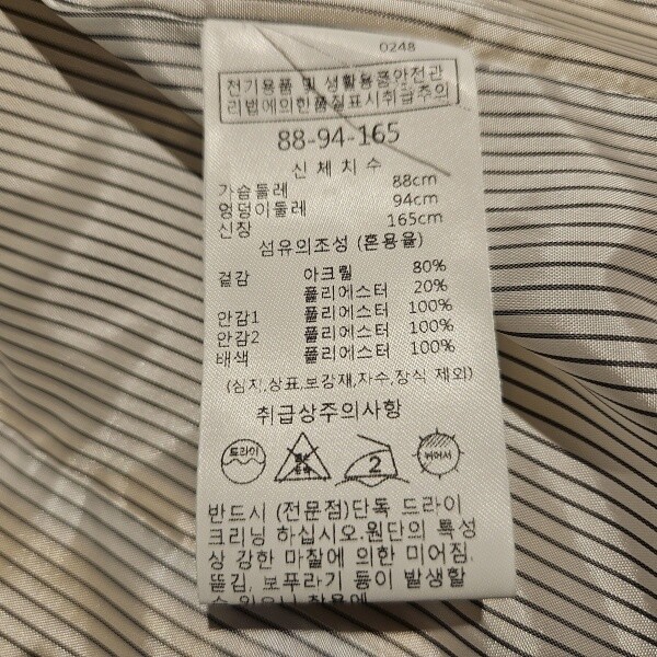제품소재 : 겉감-아크릴80%, 폴리에스터20%, 안감1-폴리에스터100%, 안감2-폴리에스터100%, 배색-폴리에스터100%