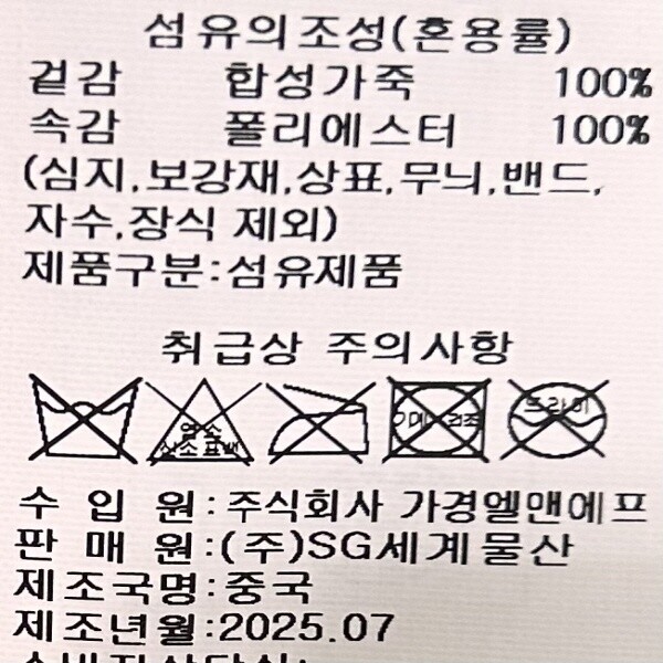| 1. 제품 소재 (섬유의 조성 또는 혼용률을 백분율로 표시, 기능성인 경우 성적서 또는 허가서) | 겉감-합성가죽100%안감-폴리에스터100% |
