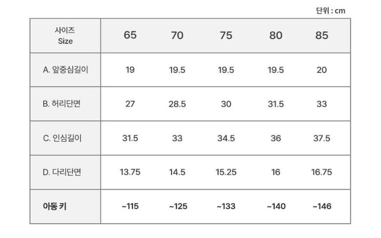 | 5. 재질 (섬유의 경우 혼용률) | 겉감 A 폴리에스터 81 폴리우레탄 19 겉감 B 폴리에스터 74 폴리우레탄 26 겉감 C 폴리에스터 85 폴리우레탄 15 안감 폴리에스터 90 폴리우레탄 10 |
