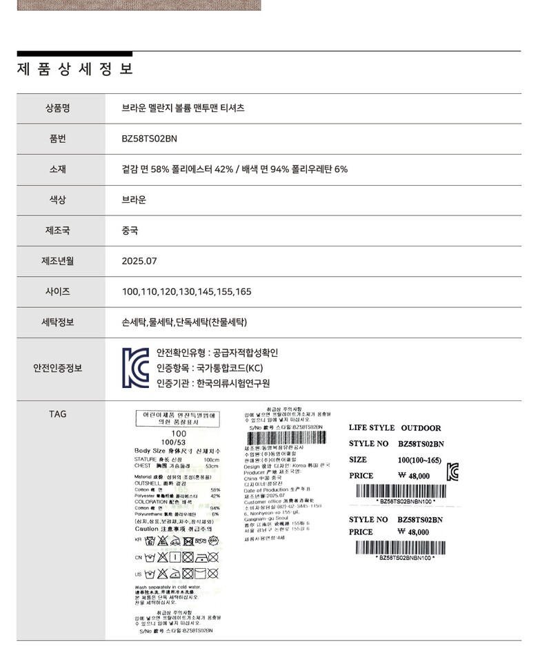 제품소재 : 겉감 면 58% 폴리에스터 42% / 배색 면 94% 폴리우레탄 6%