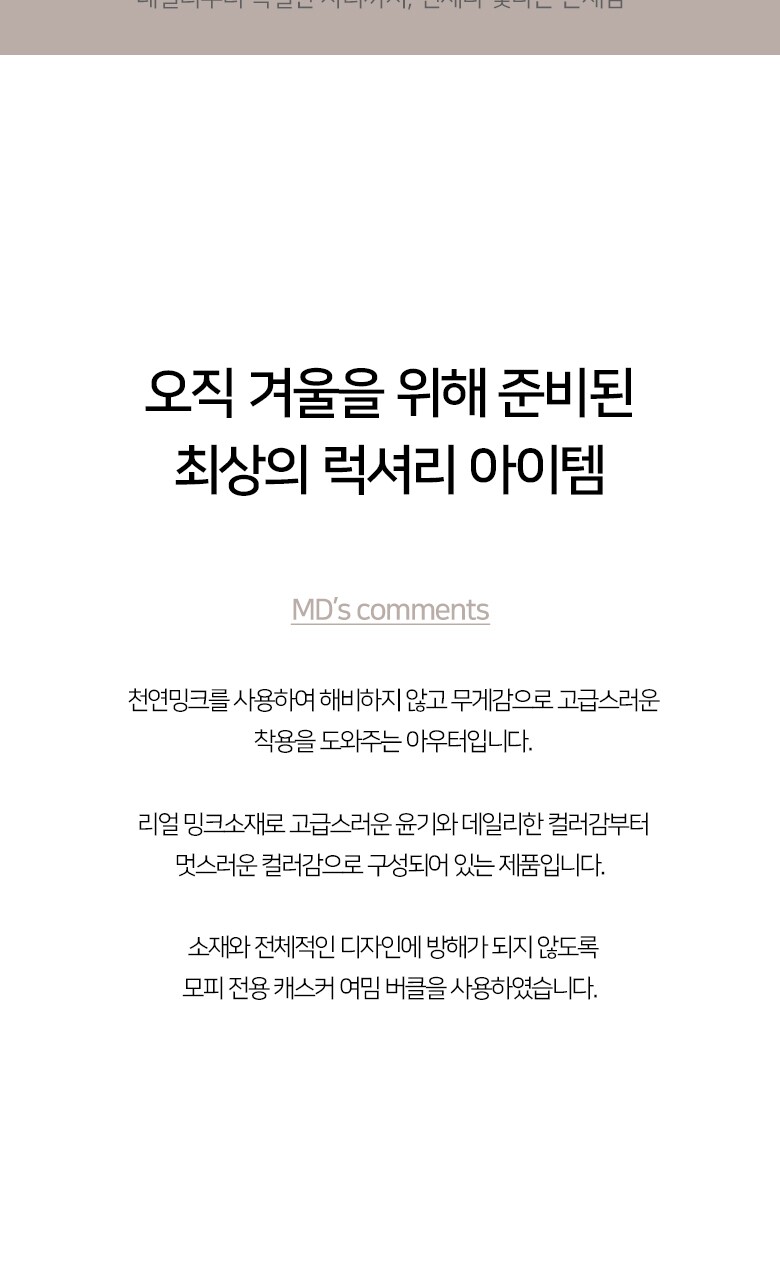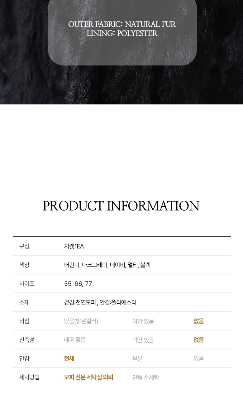 1. 제품 소재 (섬유의 조성 또는 혼용률을 백분율로 표시, 기능성인 경우 성적서 또는 허가서) | 겉감:천연모피 안감:폴리에스터100% |