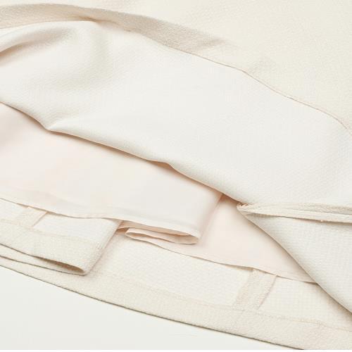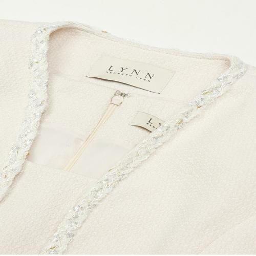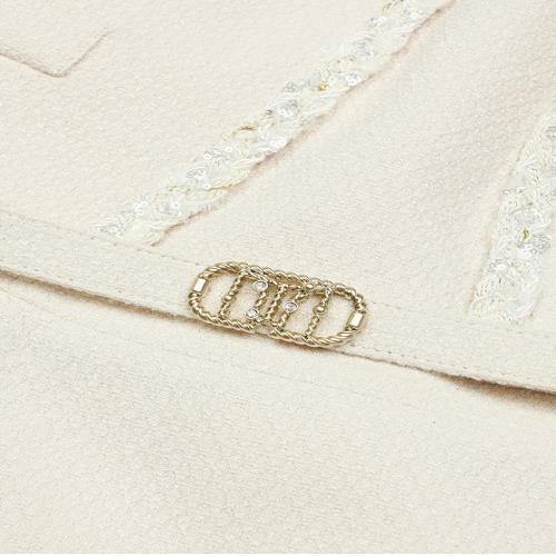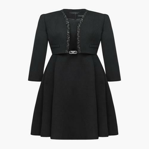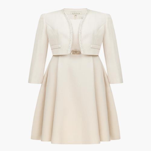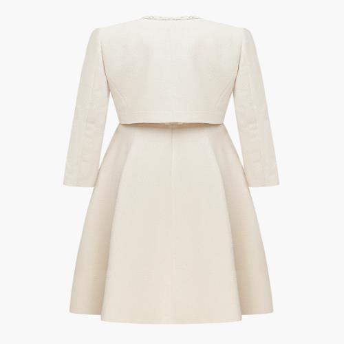 고급스러운 트리밍이 돋보이는 자켓과 플레어 원피스가 세트로 구성된 아이템입니다.