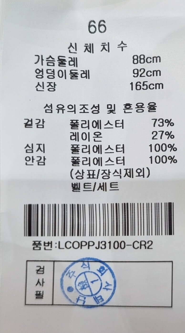 | 1. 제품 소재 (섬유의 조성 또는 혼용률을 백분율로 표시, 기능성인 경우 성적서 또는 허가서) | 폴리에스터73%, 레이온27% |