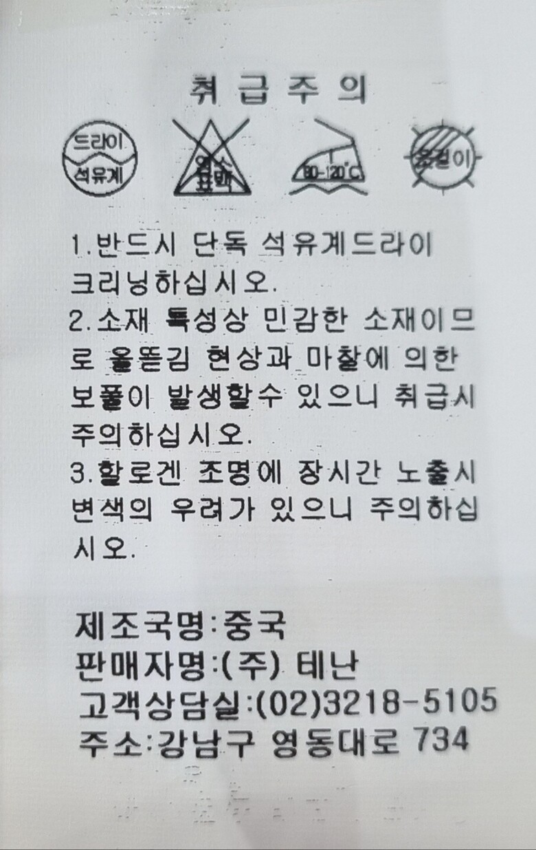 | 6. 세탁방법 및 취급시 주의사항 | 반드시 단독 석유계 드라이크리닝하십시오. |