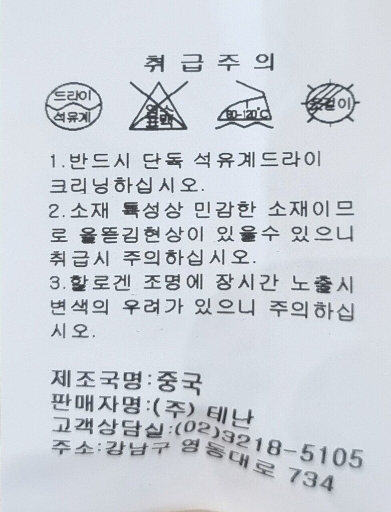 6. 세탁방법 및 취급시 주의사항 1.반드시 단독 석유계 드라이크리닝하십시오. 2.소재특성상 민감한 소재이므로 올뜯김현상이 있을수 있으니 취급시 주의하십시오. 3.습윤시 마찰에 의한 이염현상에 주의하십시오.