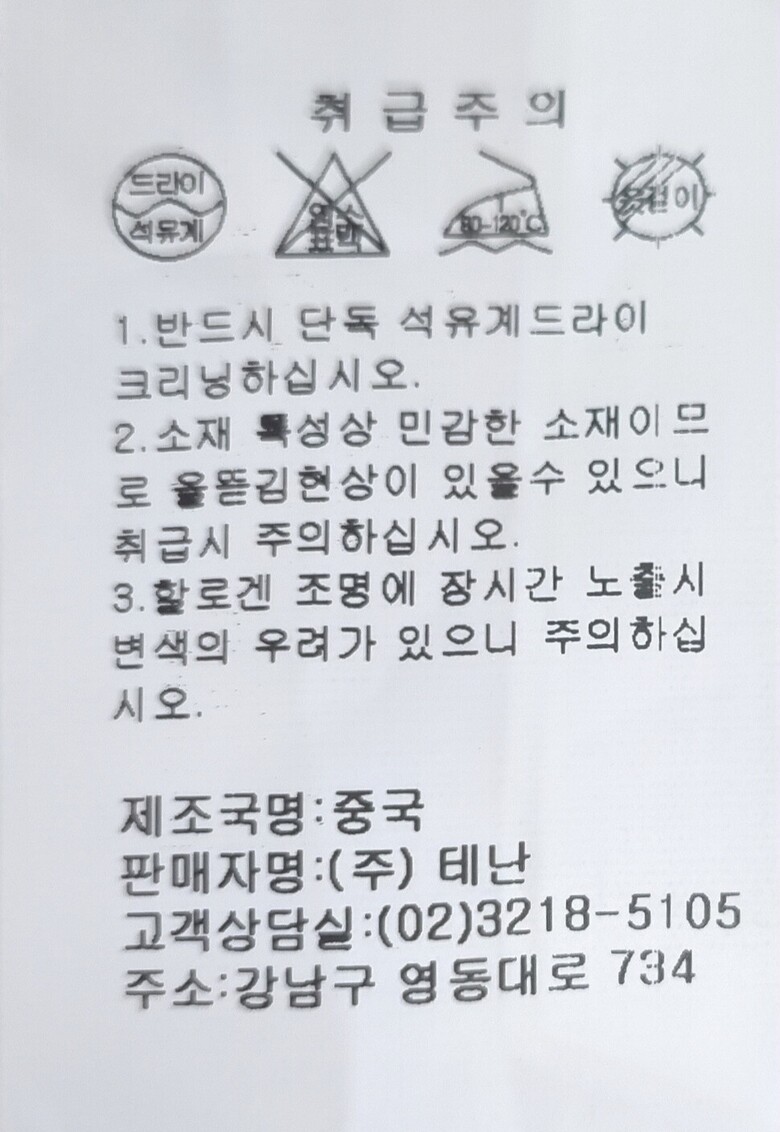 | 6. 세탁방법 및 취급시 주의사항 | 1.반드시 단독 석유계 드라이크리닝하십시오. 2.소재특성상 민감한 소재이므로 올뜯김현상이 있을수 있으니 취급시 주의하십시오. 3.습윤시 마찰에 의한 이염현상에 주의하십시오. |