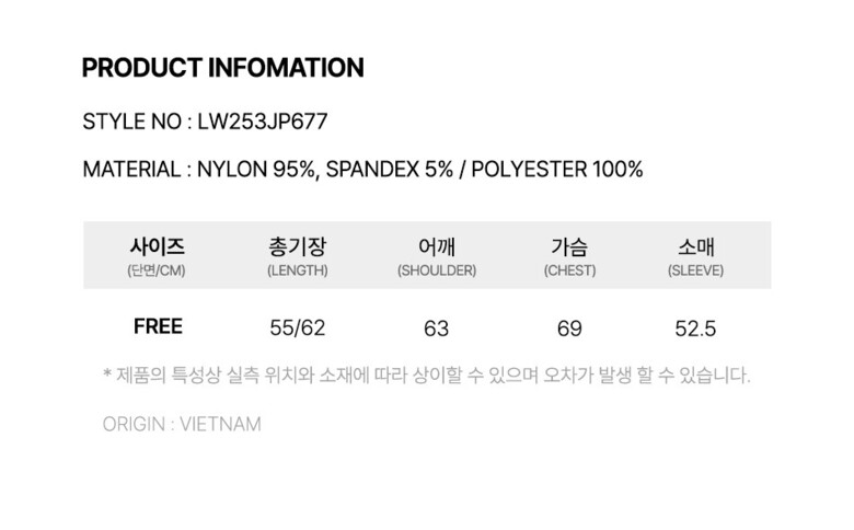 1. 제품 소재 (섬유의 조성 또는 혼용률을 백분율로 표시, 기능성인 경우 성적서 또는 허가서) 겉감:나일론 95%, 폴리우레탄 5%