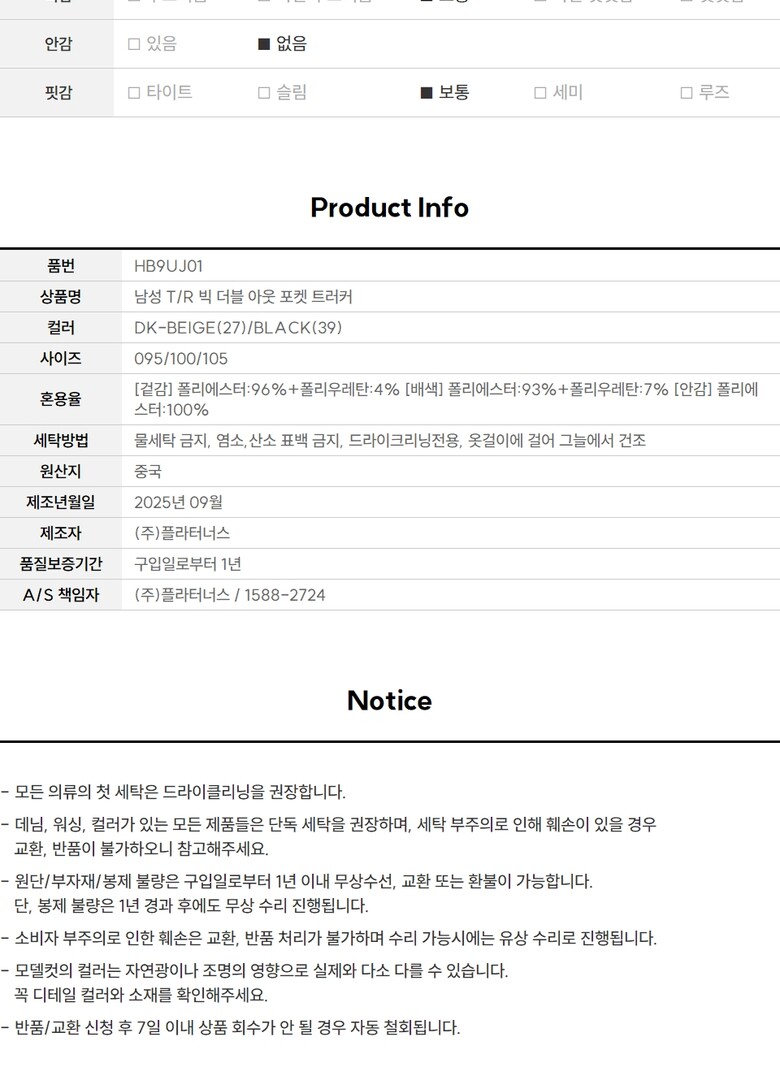1. 제품 소재 (섬유의 조성 또는 혼용률을 백분율로 표시, 기능성인 경우 성적서 또는 허가서) | [겉감] 폴리에스터:96%+폴리우레탄:4% [배색] 폴리에스터:93%+폴리우레탄:7% [안감] 폴리에스터:100% |