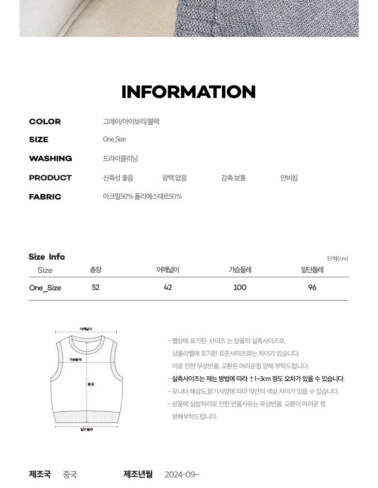 1. 제품 소재 (섬유의 조성 또는 혼용률을 백분율로 표시, 기능성인 경우 성적서 또는 허가서) | 아크릴50% 폴리에스테르50% |