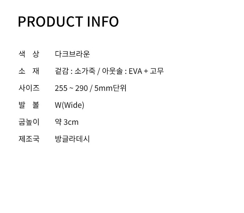 1. 제품 소재 (운동화인 경우에는 겉감, 안감을 구분하여 표시) | 겉감:소가죽 / 아웃솔 : EVA+고무 |