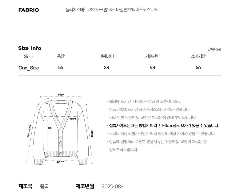 | 1. 제품 소재 (섬유의 조성 또는 혼용률을 백분율로 표시, 기능성인 경우 성적서 또는 허가서) | 폴리에스테르28% 아크릴28% 나일론22% 비스코스22% |