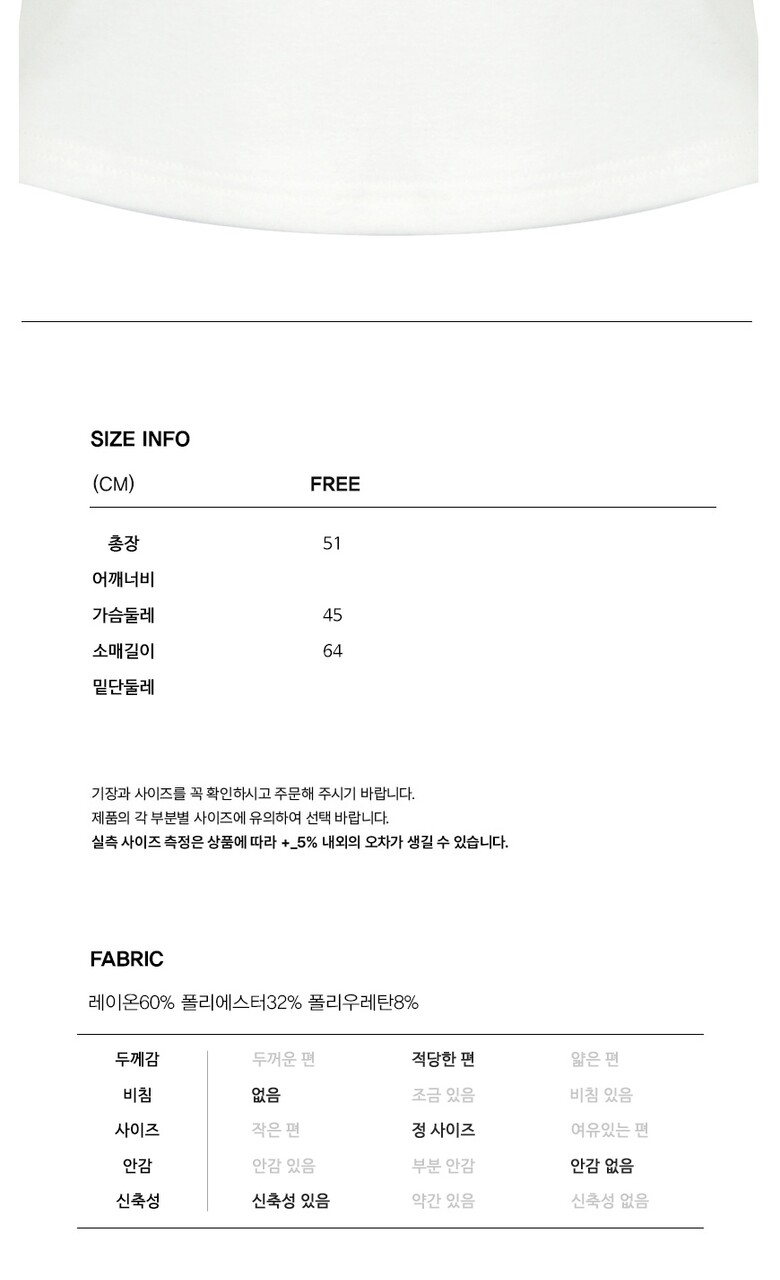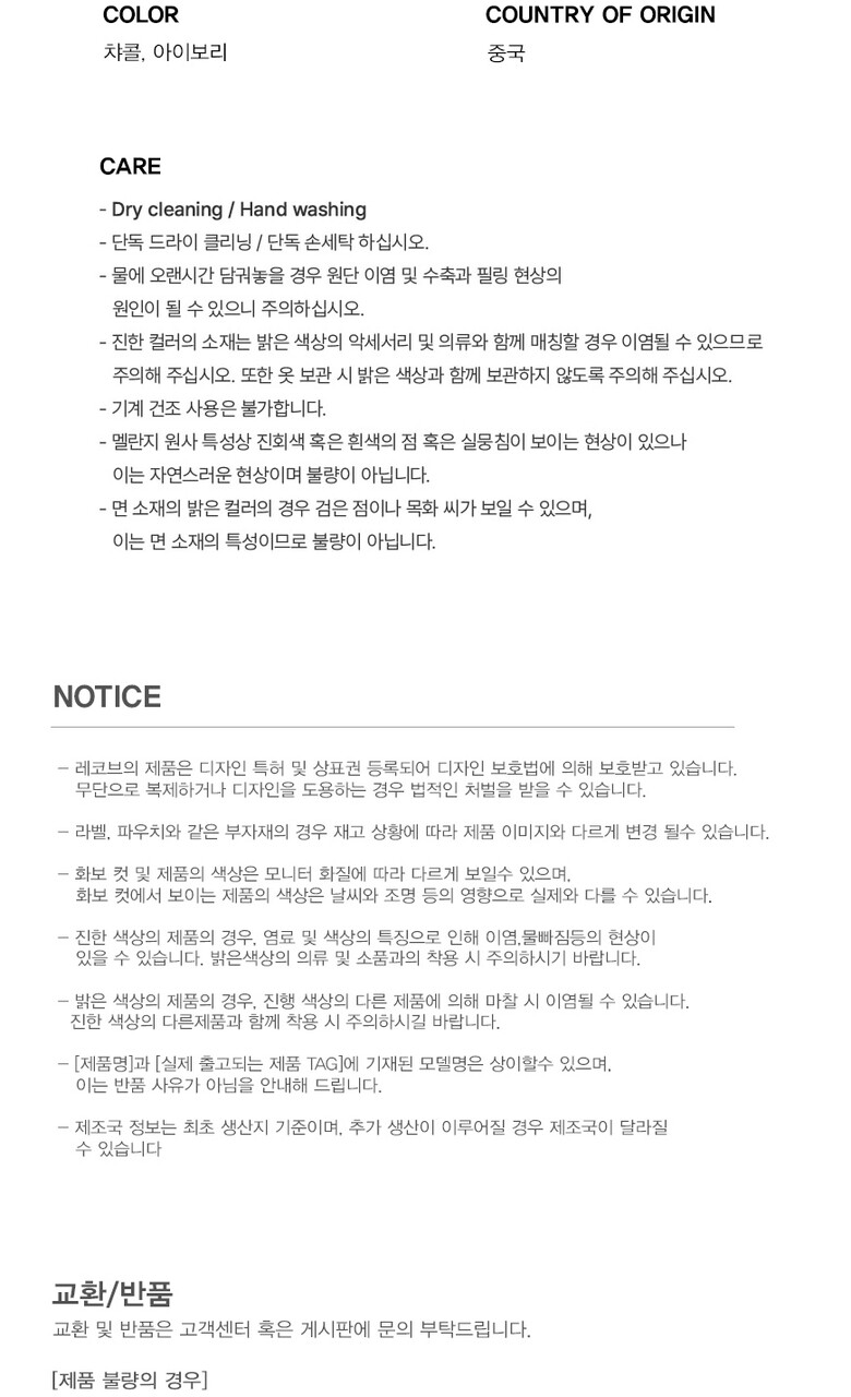 • 처음 배송된 상품상태와 다를 경우(세탁/착용 후 외출하신 경우) 반품이 불가합니다.