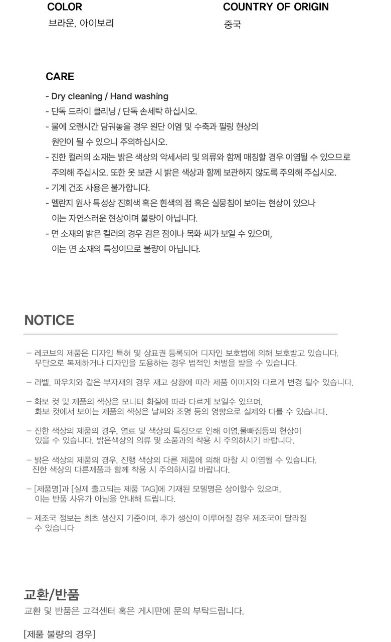 1. 제품 소재 (섬유의 조성 또는 혼용률을 백분율로 표시, 기능성인 경우 성적서 또는 허가서) | 상세페이지 참조 |