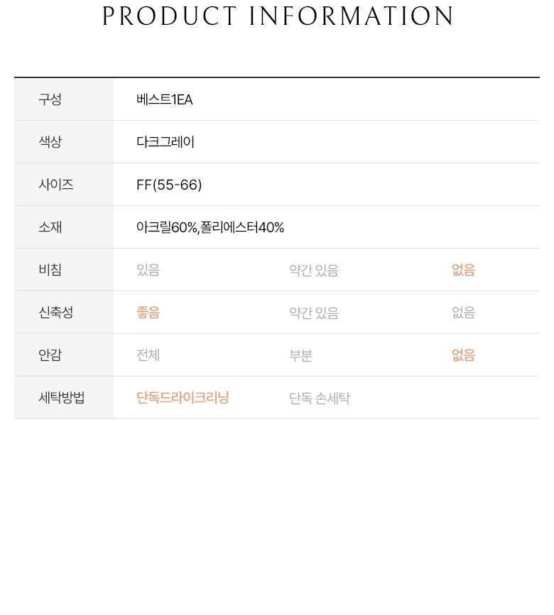1. 제품 소재 (섬유의 조성 또는 혼용률을 백분율로 표시, 기능성인 경우 성적서 또는 허가서) | 아크릴60%,폴리에스터40% |