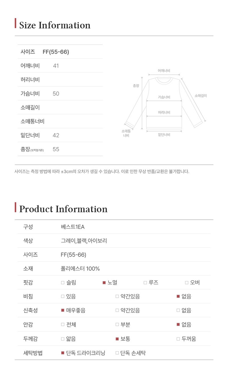 • 처음 배송된 상품상태와 다를 경우(세탁/착용 후 외출하신 경우) 반품이 불가합니다.