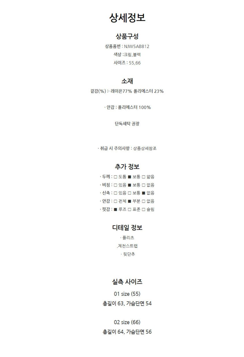 | 1. 제품 소재 (섬유의 조성 또는 혼용률을 백분율로 표시, 기능성인 경우 성적서 또는 허가서) | 겉감:레이온 77%, 폴리에스테르 23% / 안감:폴리에스테르 100% |