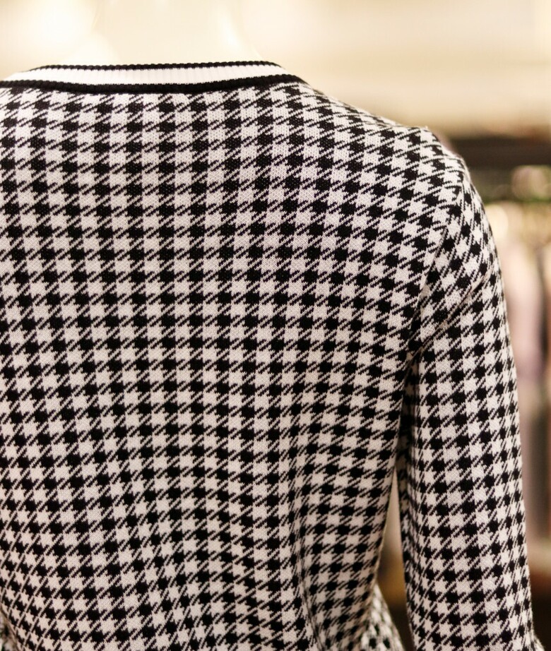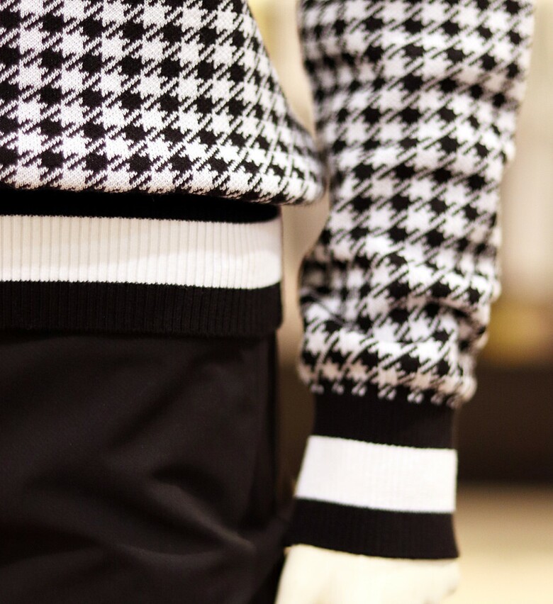 지도리 패턴 자카드가 특징인 라운드넥 스웨터입니다