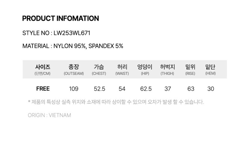 | 1. 제품 소재 (섬유의 조성 또는 혼용률을 백분율로 표시, 기능성인 경우 성적서 또는 허가서) | 겉감:나일론 95%,폴리우레탄5% |