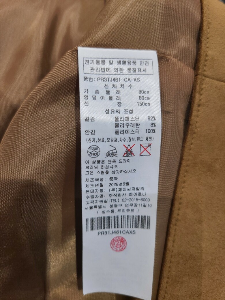 1. 제품 소재 (섬유의 조성 또는 혼용률을 백분율로 표시, 기능성인 경우 성적서 또는 허가서) 폴리우레탄 8% / 안감:폴리에스테르 100%