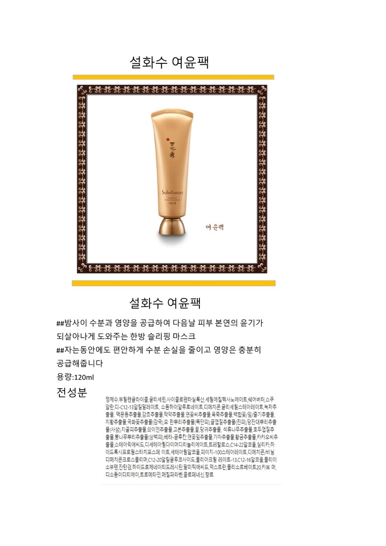 7. 주요성분 | 정제수, 프로판디올, 스쿠알란, 백화사설초추출물, 디메치콘, 부틸렌글라이콜, 감초추출물, 메도우폼씨오일, 글리세린, 작약추출물, 연꽃추출물, 옥죽추출물, 마돈나백합비늘줄기추출물, 지황추출물, 꿀, 녹차추출물, 인삼추출물, 하이드롤라이즈드인삼사포닌, 뽕나무뿌리추출물, 쉐어버터, 1, 2-헥산디올, C12-20알킬글루코사이드, C14-22알코올, 글리세릴스테아레이트, 글리세릴카프릴레이트, 라우릭애씨드, 메톡시피이지-114/폴리엡실론카프롤락톤, 미리스틱애씨드, 베헤닐알코올, 스테아릭애씨드, 아라키딜글루코사이드, 아라키딜알코올, 에칠헥실글리세린, 잔탄검, 카보머, 카프릴릴글라이콜, 트로메타민, 팔미틱애씨드, 하이드로제네이티드레시틴, 디소듐이디티에이, 페녹시에탄올, 향료, 제라니올, 시트랄, 리날룰, 시트로넬올, 리모넨 확인 |