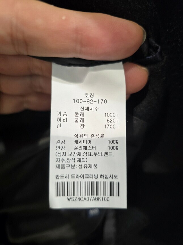 1. 제품 소재 (섬유의 조성 또는 혼용률을 백분율로 표시, 기능성인 경우 성적서 또는 허가서) 겉감 : 캐시미어 100% 안감 : 폴리에스터 100% (심지,보강재,상표,