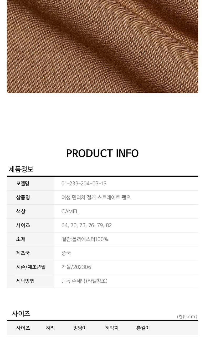 3. 치수 | 64사이즈기준실측 : 허리34cm, 엉덩이46cm, 허벅지51cm, 총길이87cm |