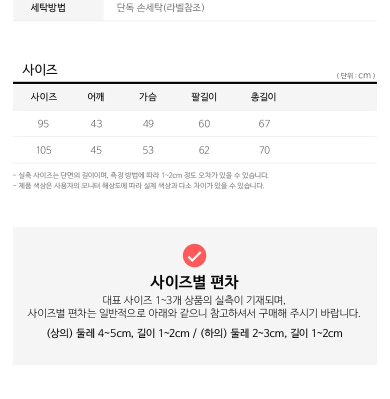 3. 치수 | 95사이즈기준실측 : 어깨43cm, 가슴49cm, 팔길이60cm, 총길이67cm |