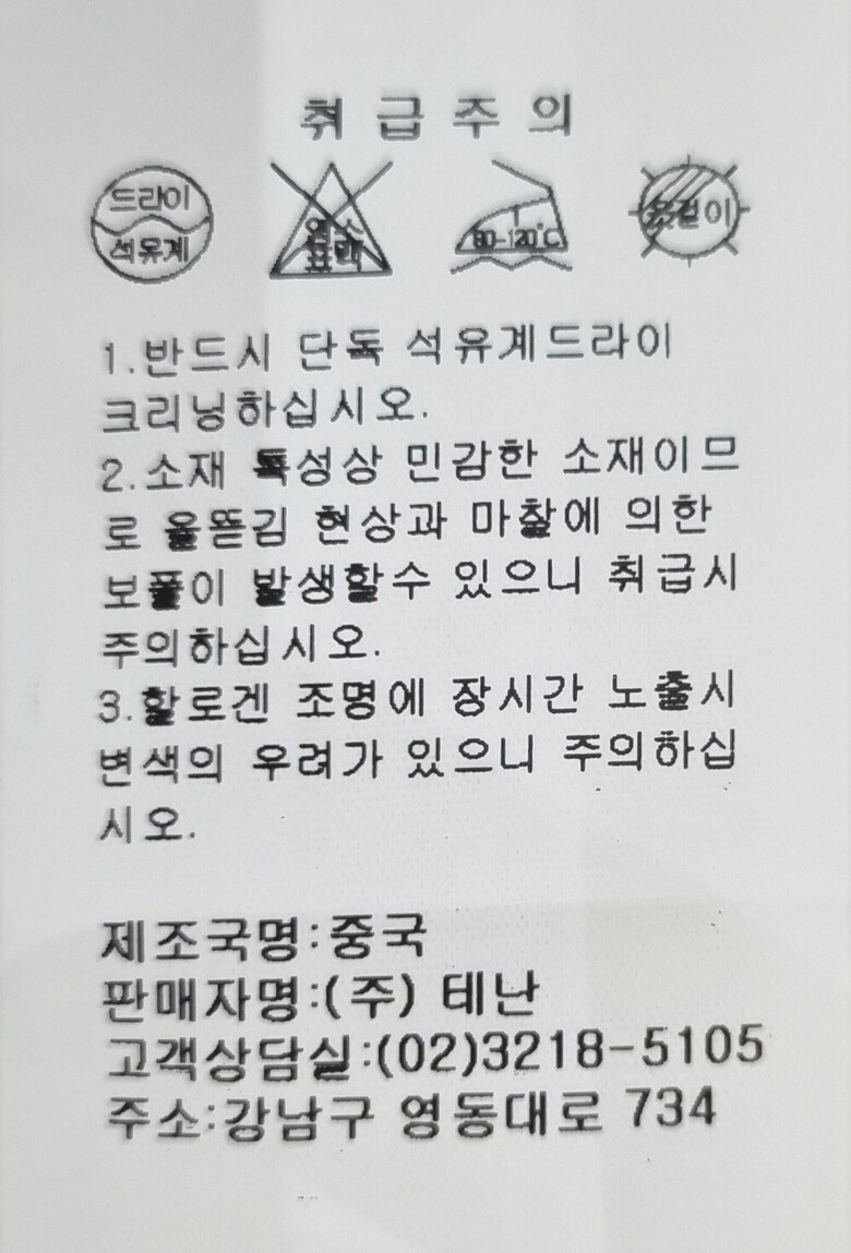 6. 세탁방법 및 취급시 주의사항 | 1.반드시 단독 석유계 드라이크리닝하십시오. 2.소재 특성상 민감한 소재이므로 올뜯김현상과 마찰에 의한 보풀이 발생할 수 있으니 취급시 주의하십시오. 3.습윤시 마찰에 의한 이염현상에 주의하십시오. |