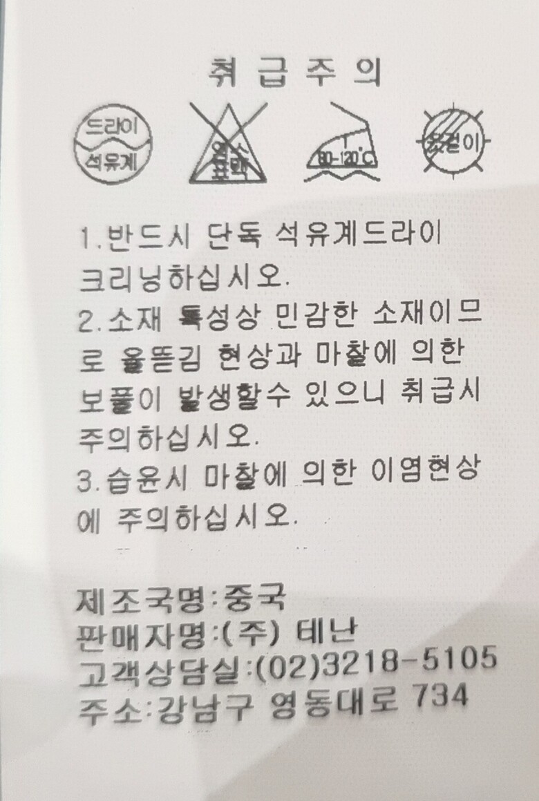 6. 세탁방법 및 취급시 주의사항 | 1.반드시 단독 석유계 드라이크리닝하십시오. 2.소재 특성상 민감한 소재이므로 올뜯김현상과 마찰에 의한 보풀이 발생할 수 있으니 취급시 주의하십시오. 3.습윤시 마찰에 의한 이염현상에 주의하십시오. |