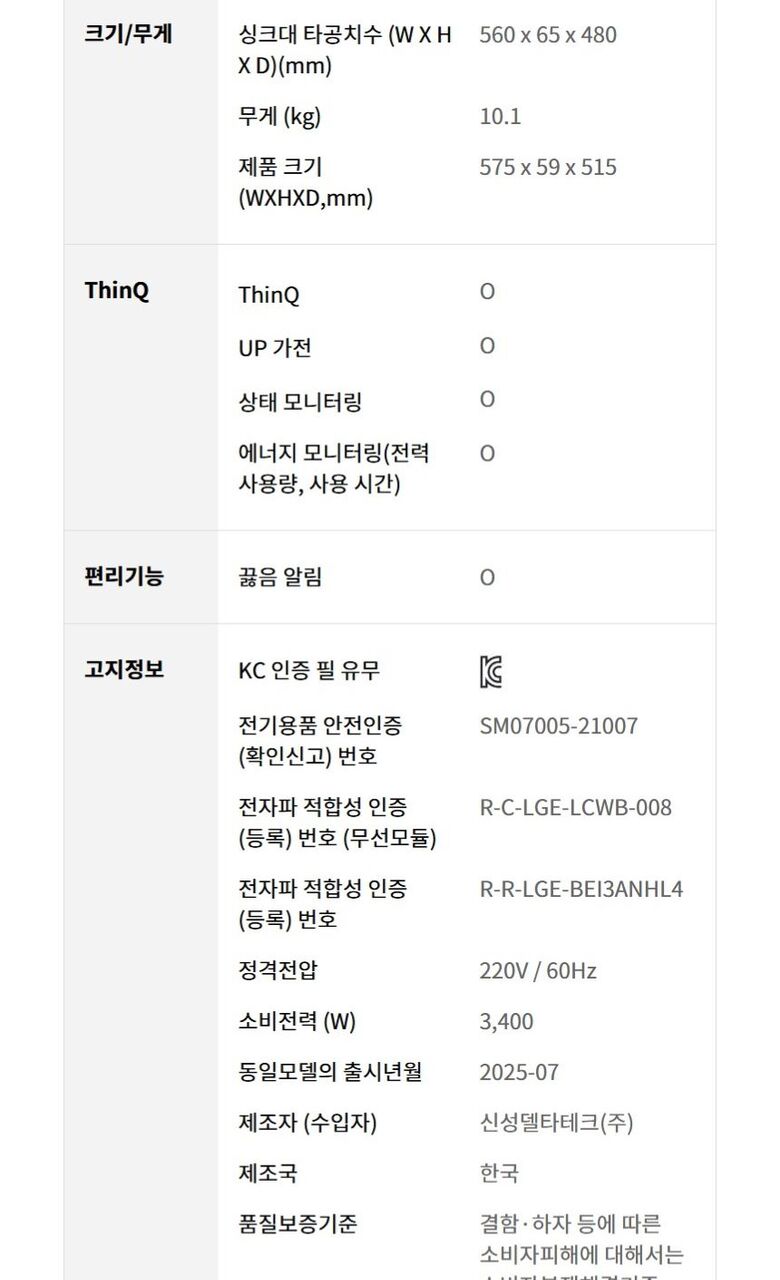 7. 정격전압,소비전력 | 220V / 60Hz, 3,400W, 1등급 |