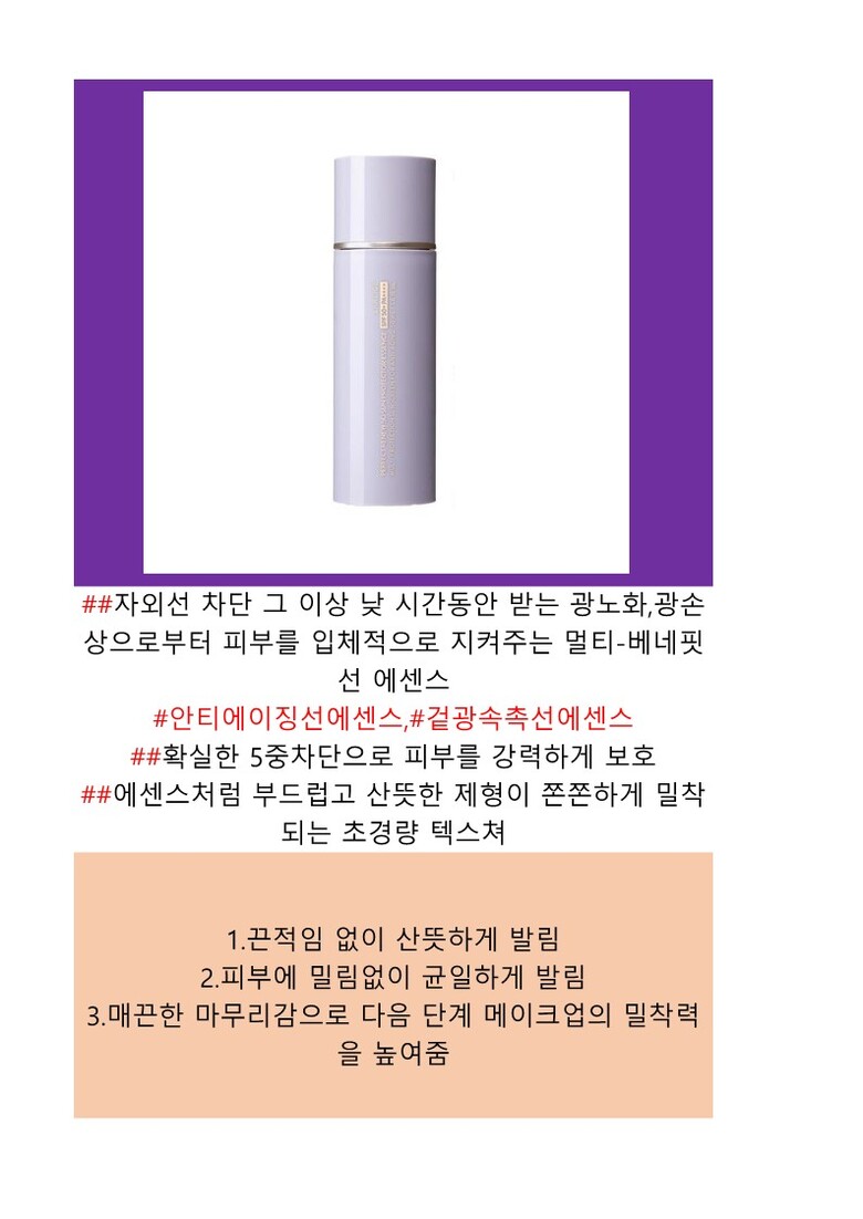 9. 사용 시 주의사항 ※ 화장품을 사용하여 다음과 같이 이상이 있을 경우 사용을 중지할 것이며 계속사용하면 증상을 악화시키므로 피부과 전문의 등에게 상담할 것 1. 사용상 붉은반점, 부어오름, 가려움증, 자극 등의 이상이 있을경우 2. 적용부의가 직사광선에 의해 위와 같은 이상이 있을 경우 3. 상처가 있는 부위, 습진 및 피부염 등의 이상이 있는 부위에는 사용을 하지 말것 4. 알코올류, 에탄올, 수용성(알코올 함유 제품에 해당)/ 화기에 주의할 것.