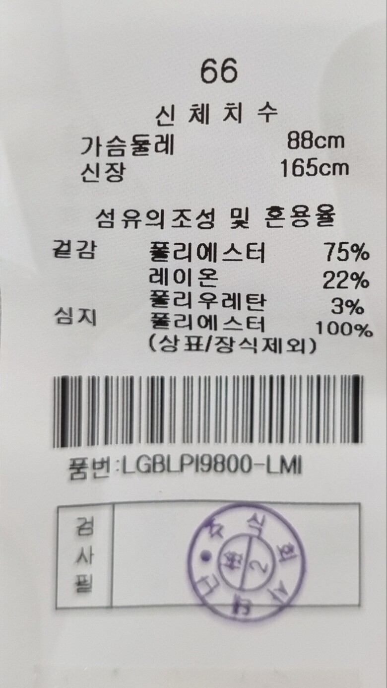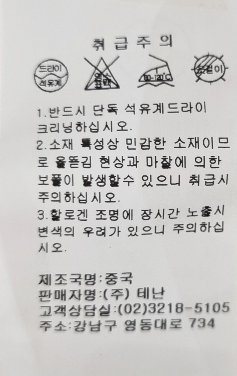 | 6. 세탁방법 및 취급시 주의사항 | 1.반드시 단독 석유계 드라이크리닝하십시오. 2.소재 특성상 민감한 소재이므로 올뜯김 현상과 마찰에 의한 보풀이 발생할 수 있으니 취급시 주의하십시오. 3.할로겐 조명에 장시간 노출시 변색의 우려가 있으니 주의하십시오. |