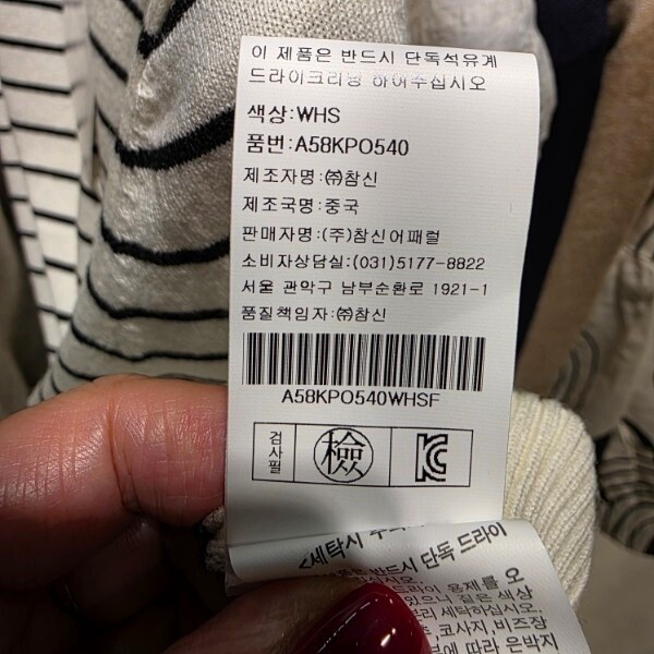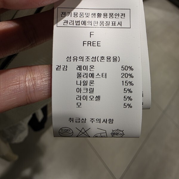 | 1. 제품 소재 (섬유의 조성 또는 혼용률을 백분율로 표시, 기능성인 경우 성적서 또는 허가서) | 레이온 50% 폴리에스터 20% 나일론 15% 아크릴 5% 라이오셀 5% 모 5% |
