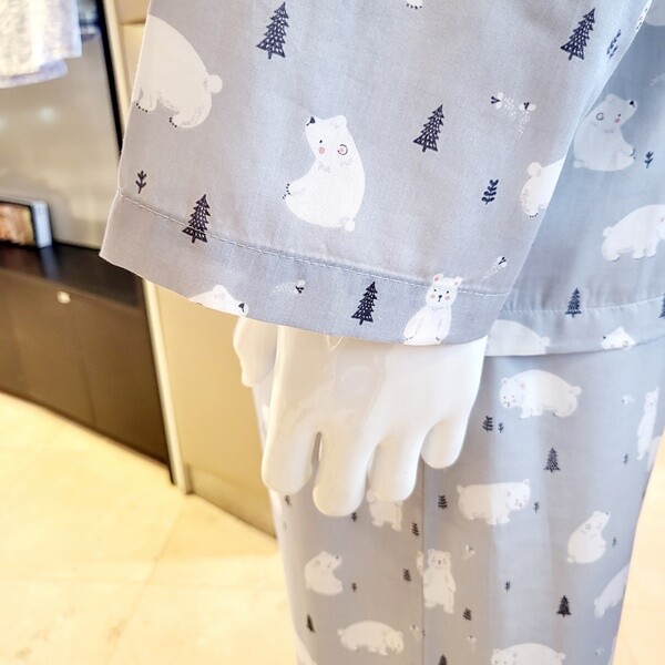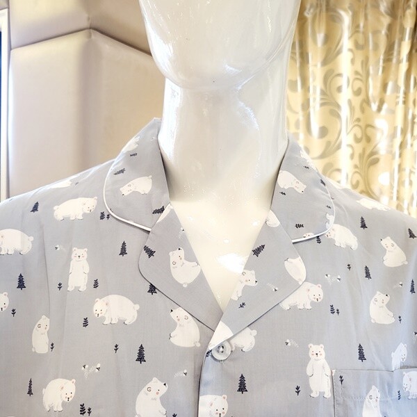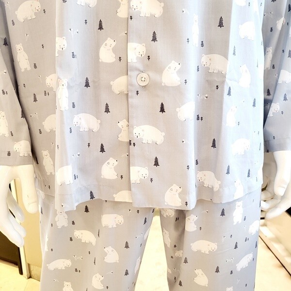 귀여운 곰 나염 남성 긴팔 긴바지 파자마 세트입니다.?블루 컬러 위에 귀여운 화이트 곰이 포인트로 올라간 남성 파자마 세트 입니다.