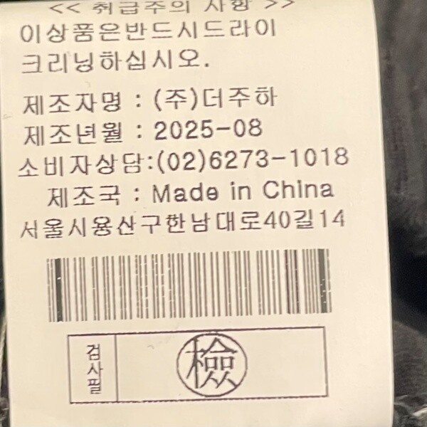 | 6. 세탁방법 및 취급시 주의사항 | 단독 드라이크리닝 하세요. 원단의 특성상 강한 마찰에 의한 보푸라기 등이 발생할수 있으니 착용에 주의바랍니다 |