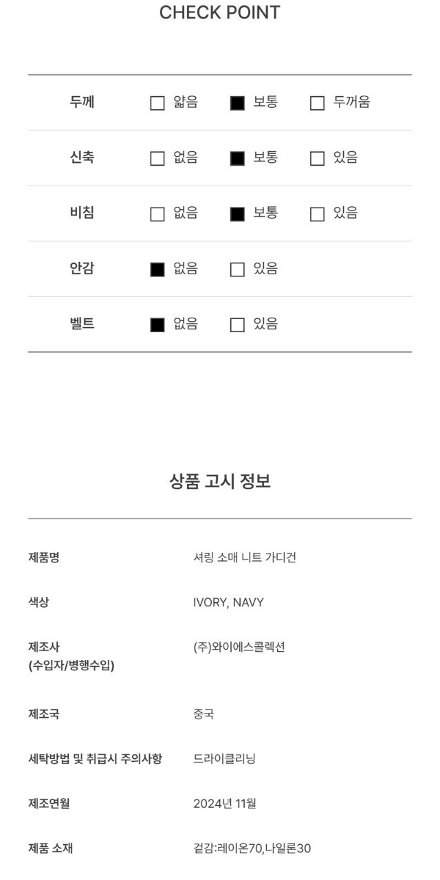 1. 제품 소재 (섬유의 조성 또는 혼용률을 백분율로 표시, 기능성인 경우 성적서 또는 허가서) | 상품상세참조 |