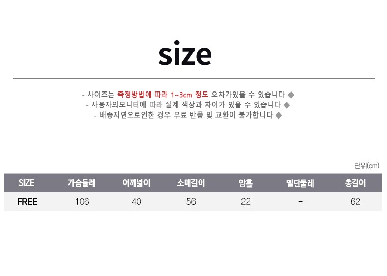 • 처음 배송된 상품상태와 다를 경우(세탁/착용 후 외출하신 경우) 반품이 불가합니다.