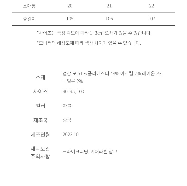 • 처음 배송된 상품상태와 다를 경우(세탁/착용 후 외출하신 경우) 반품이 불가합니다.