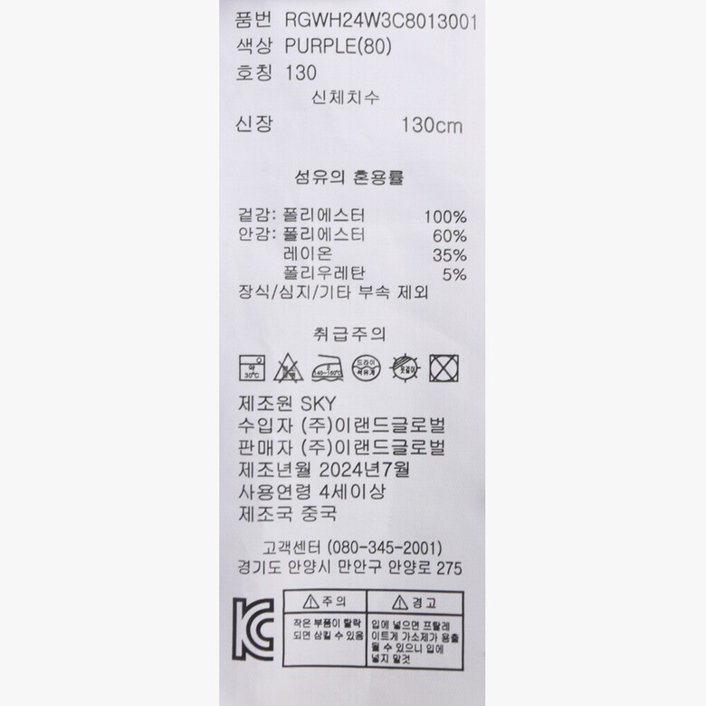 | 1. 제품 소재 (섬유의 조성 또는 혼용률을 백분율로 표시, 기능성인 경우 성적서 또는 허가서) | 상품상세참조 |